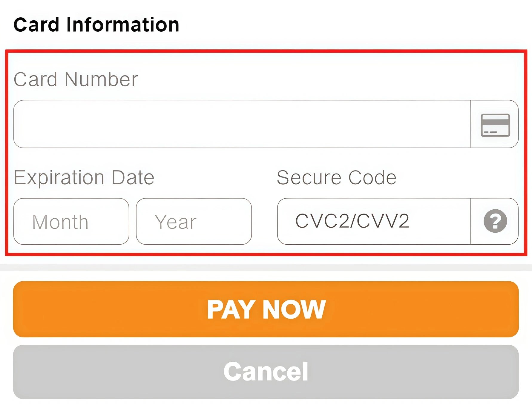 If you check out with a Debit / Credit Card, just enter your * Card Number, * Expiration Date, and * Secure Code.